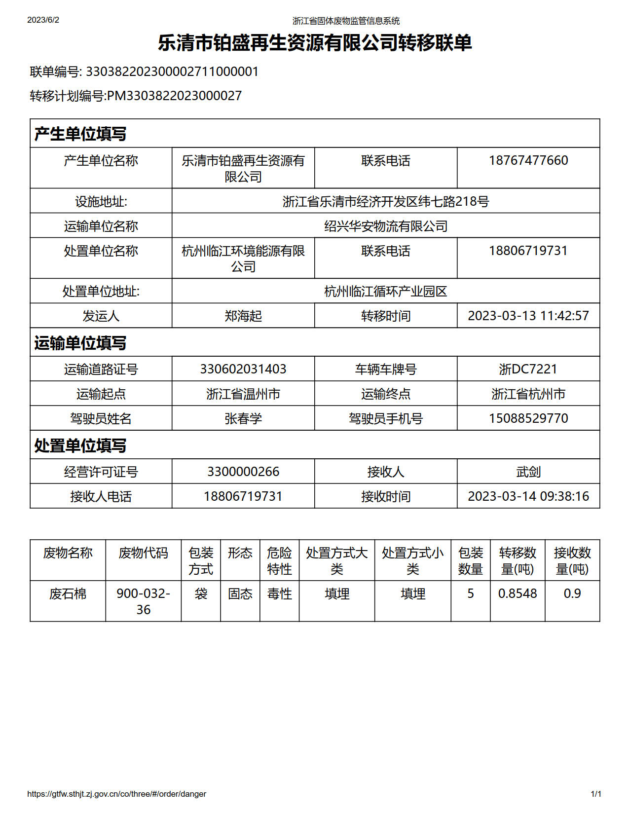 樂清市鉑盛再生資源有限公司2023年度危險廢物處置公示